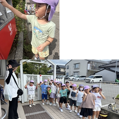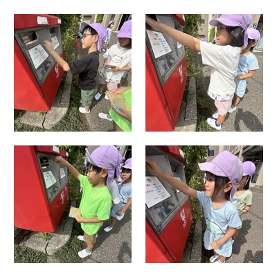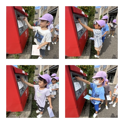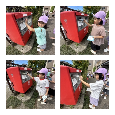 9月11日木曜日、きりんさんは諸江公民館敷地内にある郵便ポストに「敬老の日のお手紙」を投函に行ってきました。自分で書いた手紙を大切そうに投函口に入れながら、「無事届きますように」と口々に言っていました。この手紙が無事届くことを願って、敬老の日を迎えたいですね。