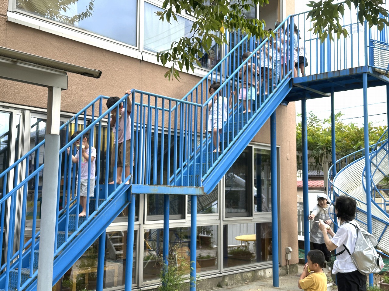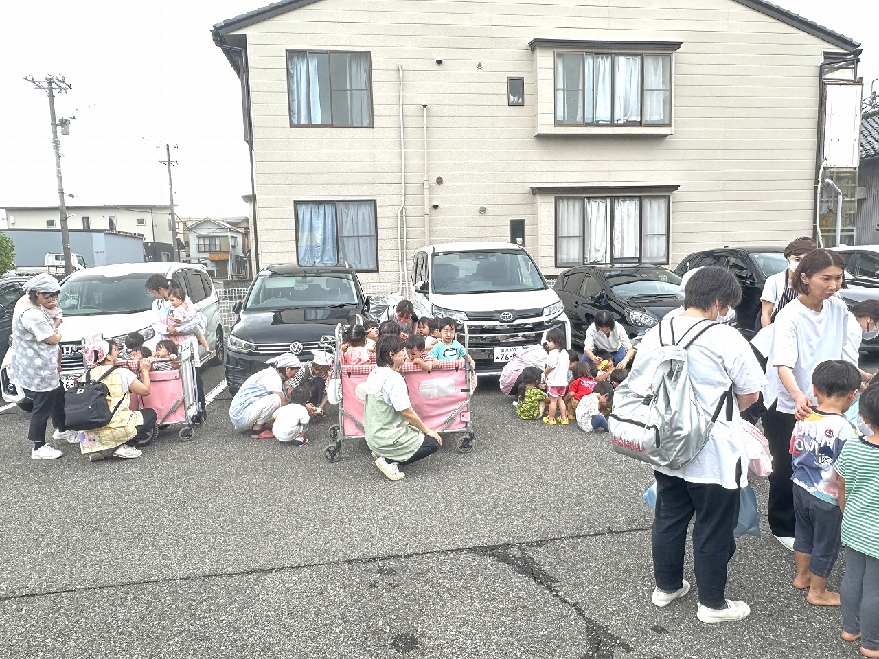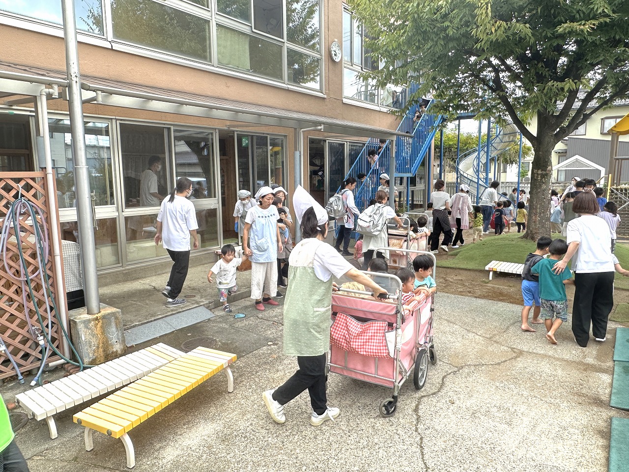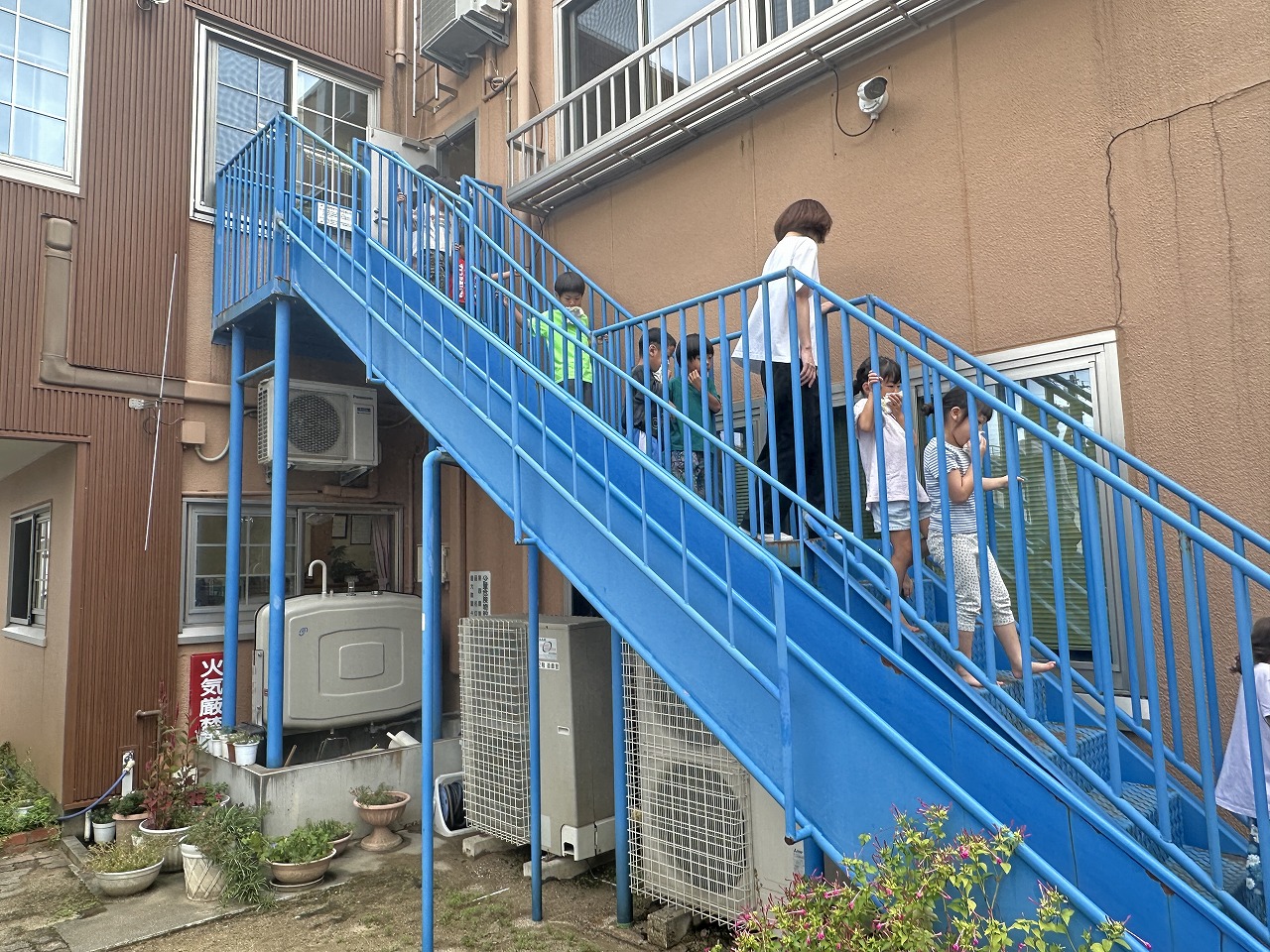 9月29日の朝、給食室出火想定の避難訓練を行いました。給食室となると、玄関からの避難や玄関に続く階段は使えません。2階の以上児さんは、避難階段を使って隣の駐車場に避難しました。1階の未満児さかは、お散歩車に乗ったり、保育士と手を繋いだり、おんぶされたりして駐車場へ。子ども達は落ち着いて移動していました。人数確認ができ、園長の話もよく聞いていました。避難訓練での約束も身についてきて、万が一火災があった時、落ち着いて行動してくれることを願っています。
