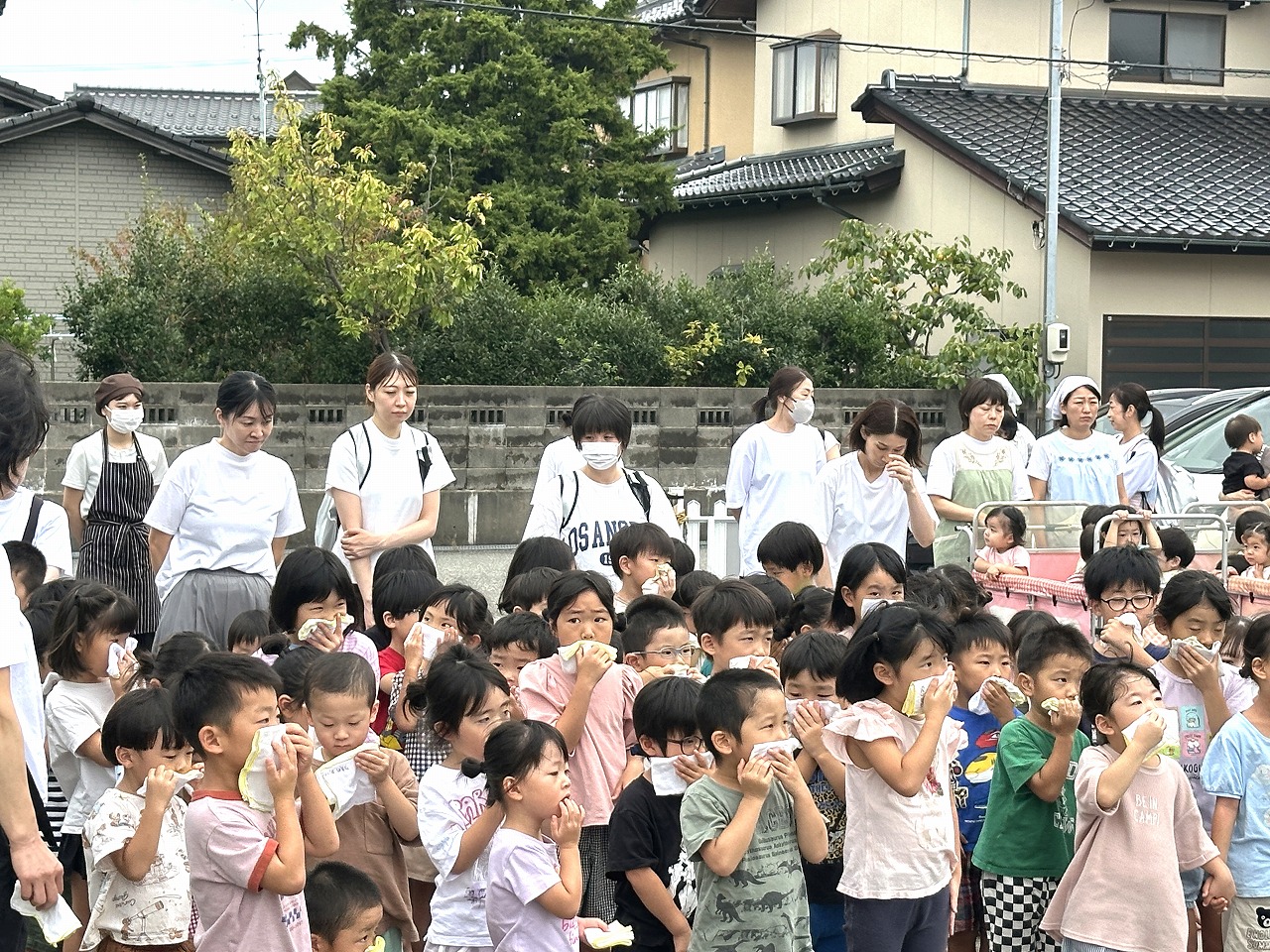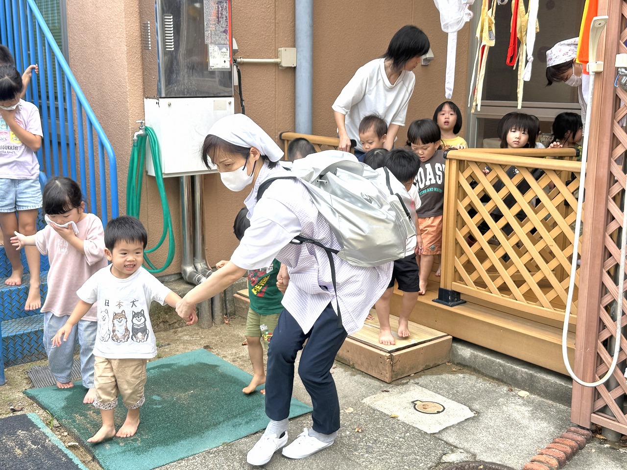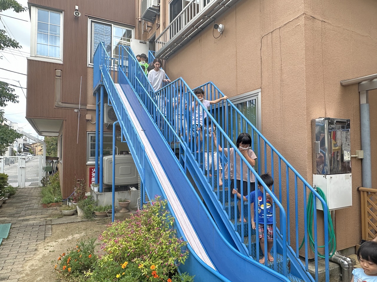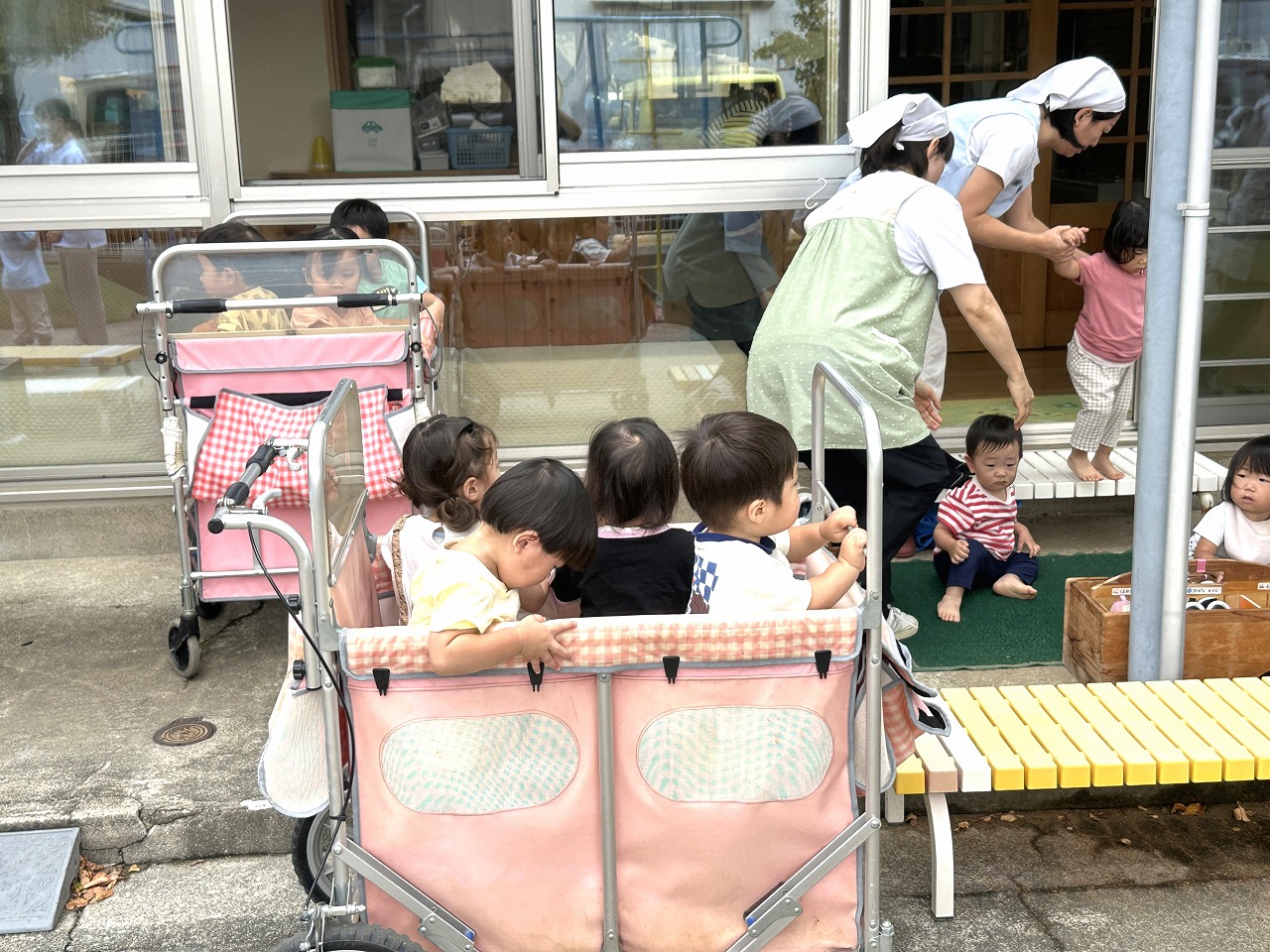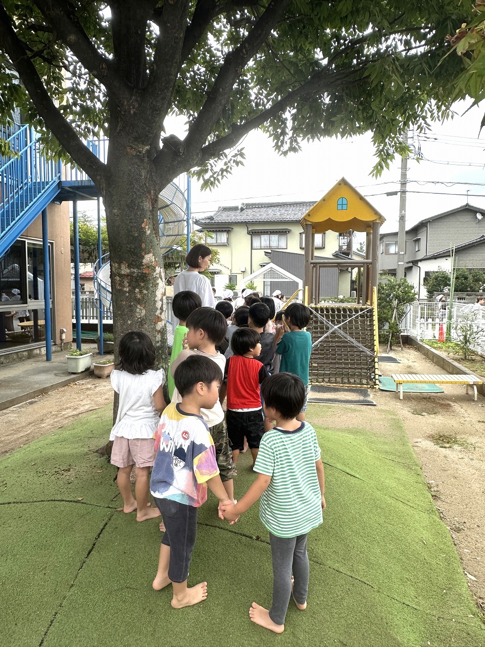 9月29日の朝、給食室出火想定の避難訓練を行いました。給食室となると、玄関からの避難や玄関に続く階段は使えません。2階の以上児さんは、避難階段を使って隣の駐車場に避難しました。1階の未満児さかは、お散歩車に乗ったり、保育士と手を繋いだり、おんぶされたりして駐車場へ。子ども達は落ち着いて移動していました。人数確認ができ、園長の話もよく聞いていました。避難訓練での約束も身についてきて、万が一火災があった時、落ち着いて行動してくれることを願っています。