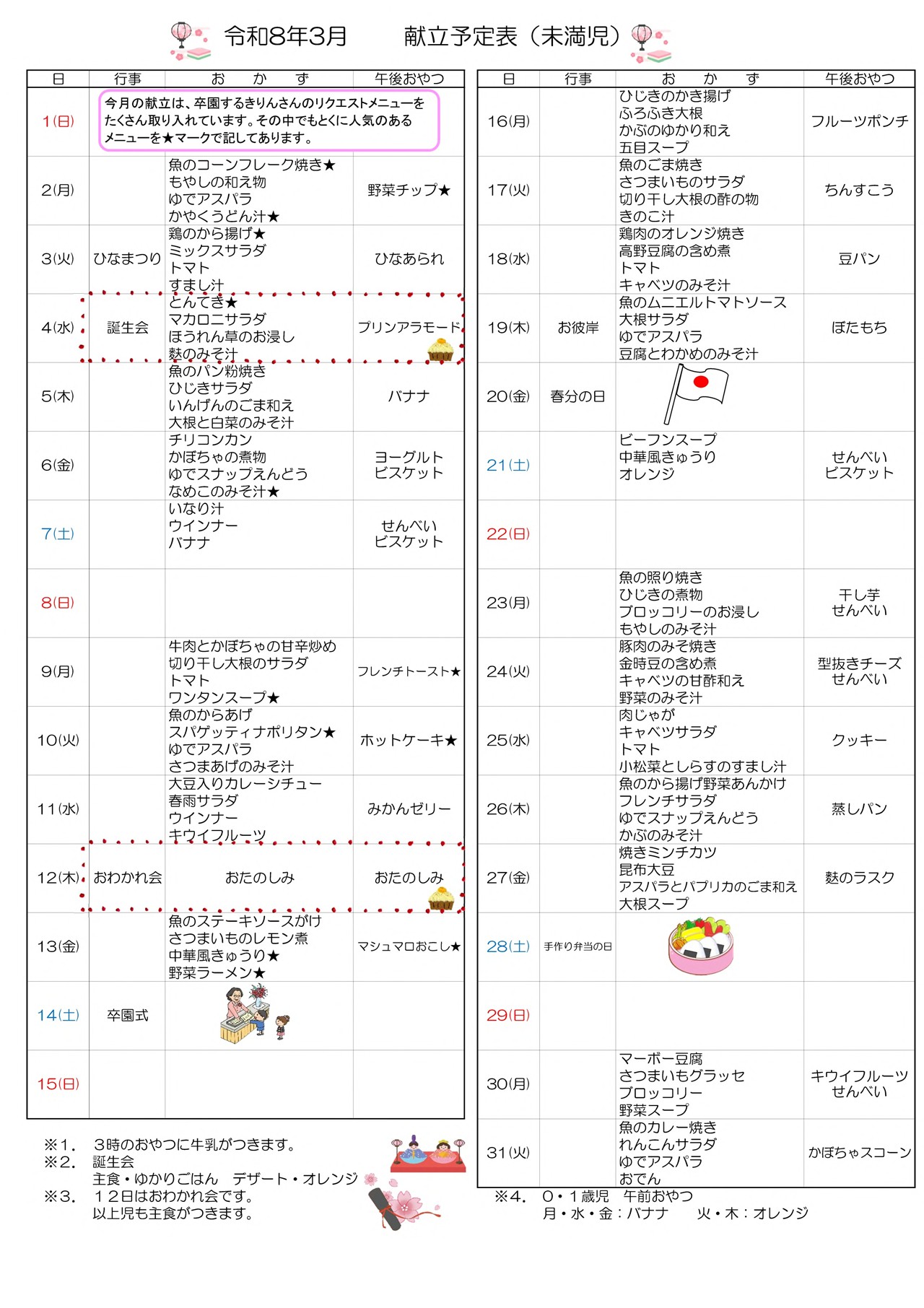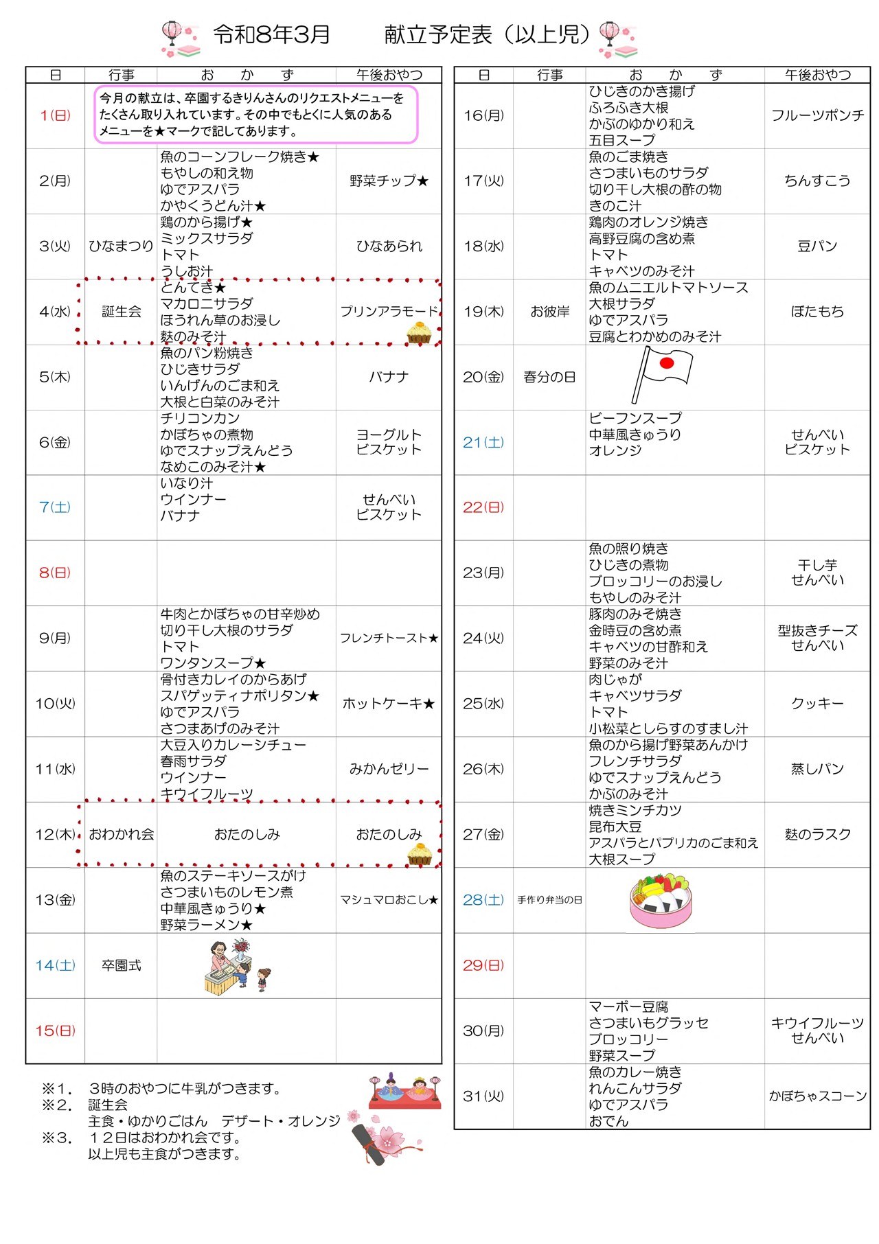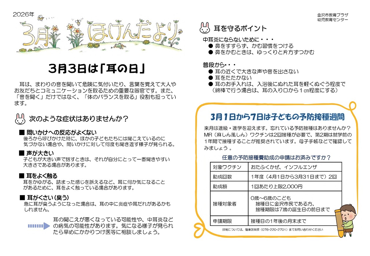 3月のおたより 園報・園だより ※タップでPDF表示 献立表 mogumogufutaba eatなう! おやつ クッキー 3月25日 献立 肉じゃが キャベツサラダ トマト 小松菜としらすのすまし汁 おやつ 型抜きチーズ せんべい 3月24日 献立 豚肉のみそ焼き 金時豆の含め煮 キャベツの甘酢和え 野菜のみそ汁 さらに読み込む... Instagram でフォロー 金沢市からのおたより ※タップでPDF表示